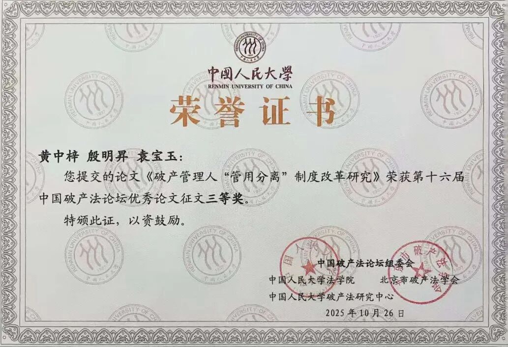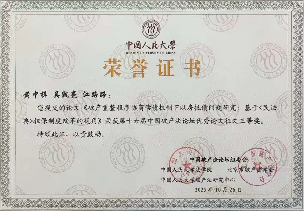 中国破产法论坛作为我国破产法领域最具影响力的学术盛会,汇聚了国内外破产法领域的顶尖学者、法官、律师和管理人等专业人士参加。本届论坛共收到来自全国的投稿论文1300余篇,经论坛组委会严格评审,黄中梓、殷明昇、袁宝玉提交的《破产管理人“管用分离”制度改革研究:基于 COSO-ERM 框架与中国式现代化视角》,黄中梓、吴凯亮、江路路提交的《破产重整程序协商偿债机制下以房抵债问题研究:基于<民法典>担保制度改革的视角》2篇论文,凭借鲜明的创新性、深厚的理论价值与突出的实务指导意义,成功斩获本次论坛征文三等奖。