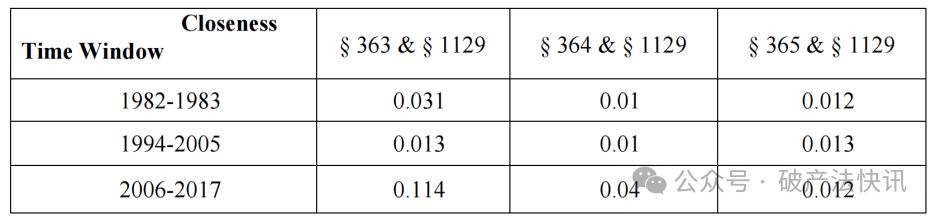 如下图所示,商业经营类条款(如第363条和第364条)与财产分配类条款(如第1129条)的共同引用系数在2006–2017年大幅提升,并且这种提升在仅仅处理待履行合同而不被用于捆绑策略的第365条中不存在。