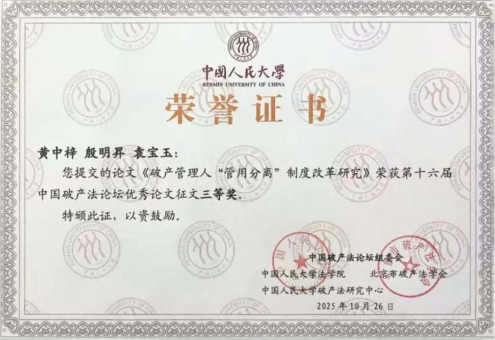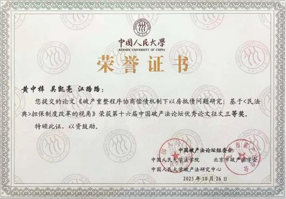 中国破产法论坛作为我国破产法领域最具影响力的学术盛会,汇聚了国内外破产法领域的顶尖学者、法官、律师和管理人等专业人士参加。本届论坛共收到来自全国的投稿论文1300余篇,经论坛组委会严格评审,黄中梓、殷明昇、袁宝玉提交的《破产管理人“管用分离”制度改革研究:基于 COSO-ERM 框架与中国式现代化视角》,黄中梓、吴凯亮、江路路提交的《破产重整程序协商偿债机制下以房抵债问题研究:基于<民法典>担保制度改革的视角》2篇论文,凭借鲜明的创新性、深厚的理论价值与突出的实务指导意义,成功荣膺本次论坛征文三等奖。