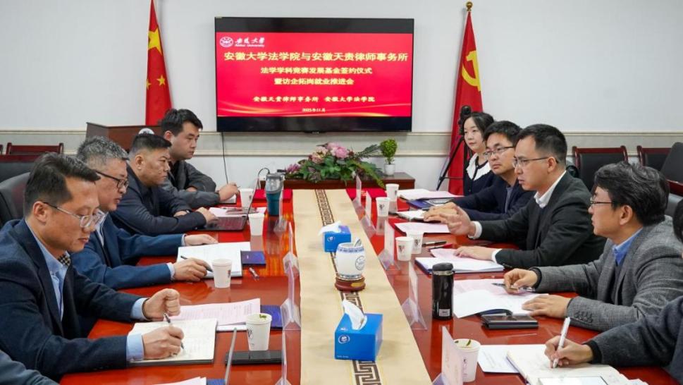 2025年11月13日15:30,安徽大学法学院与安徽天贵律师事务所法学学科竞赛发展基金签约仪式暨访企拓岗就业推进会议在磬苑校区社科楼A207会议室圆满举行。安徽大学党委常委、副校长陈城,法学院党委书记毕金平、党委副书记兼纪委书记鲍励,学生就业指导中心副主任高超峰等校方代表,与安徽天贵律师事务所主任黄中梓,安徽天贵(合肥)律师事务所主任方海峰、副主任吴凯亮、江路路等律所核心团队齐聚一堂,以专项基金为纽带,共绘法治人才培养与法律实务深度融合的合作蓝图。