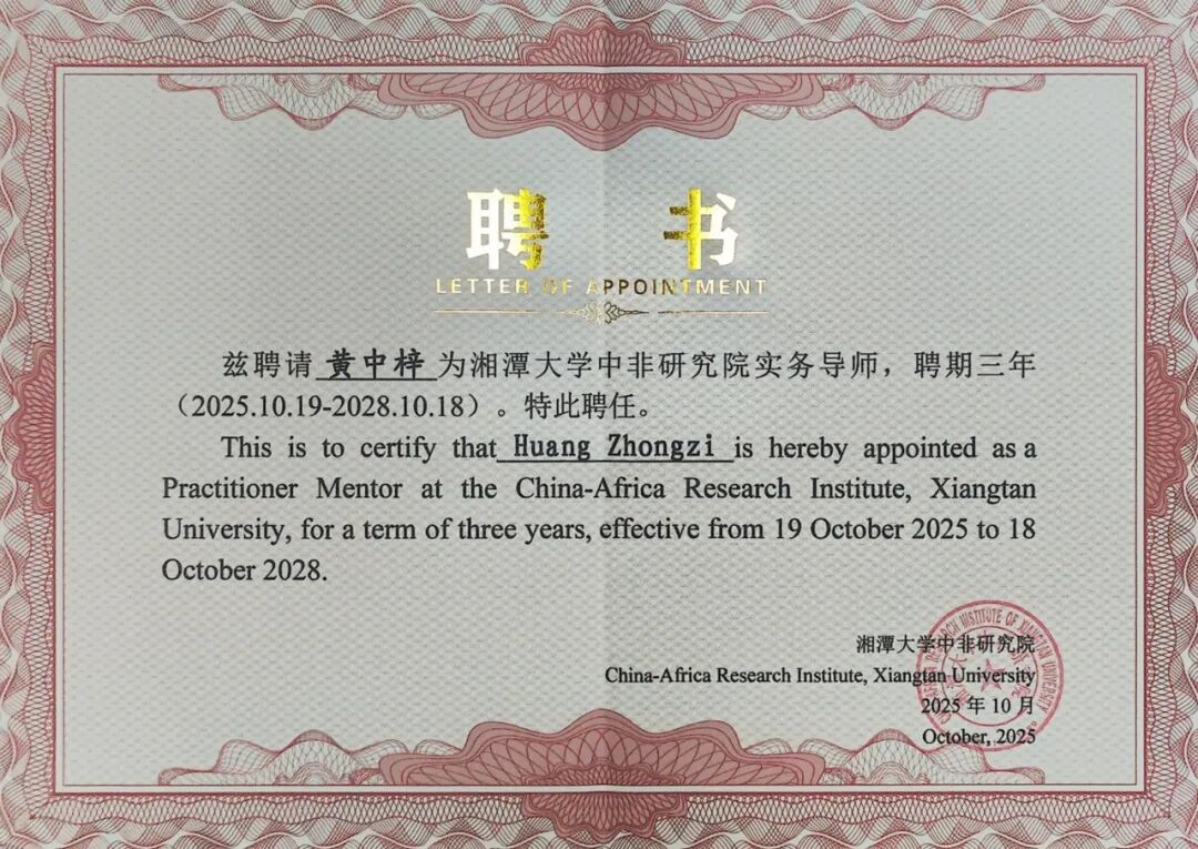 2025年10月19日,湘潭大学中非研究院成立大会暨区域国别学科发展论坛在该校隆重召开。在这场汇聚政、学、研、实务界多方力量的学术盛会上,安徽天贵律师事务所主任黄中梓被正式聘为中非研究院实务导师,与其他6位业界精英共同跻身中非研究院实务指导核心团队的行列。湘大中非研究院实务导师将以涉非法律等多领域实务研究的深厚积淀,为中非合作的专业人才培养注入专业动能,搭建起学界与实务界携手赋能中非发展的桥梁。