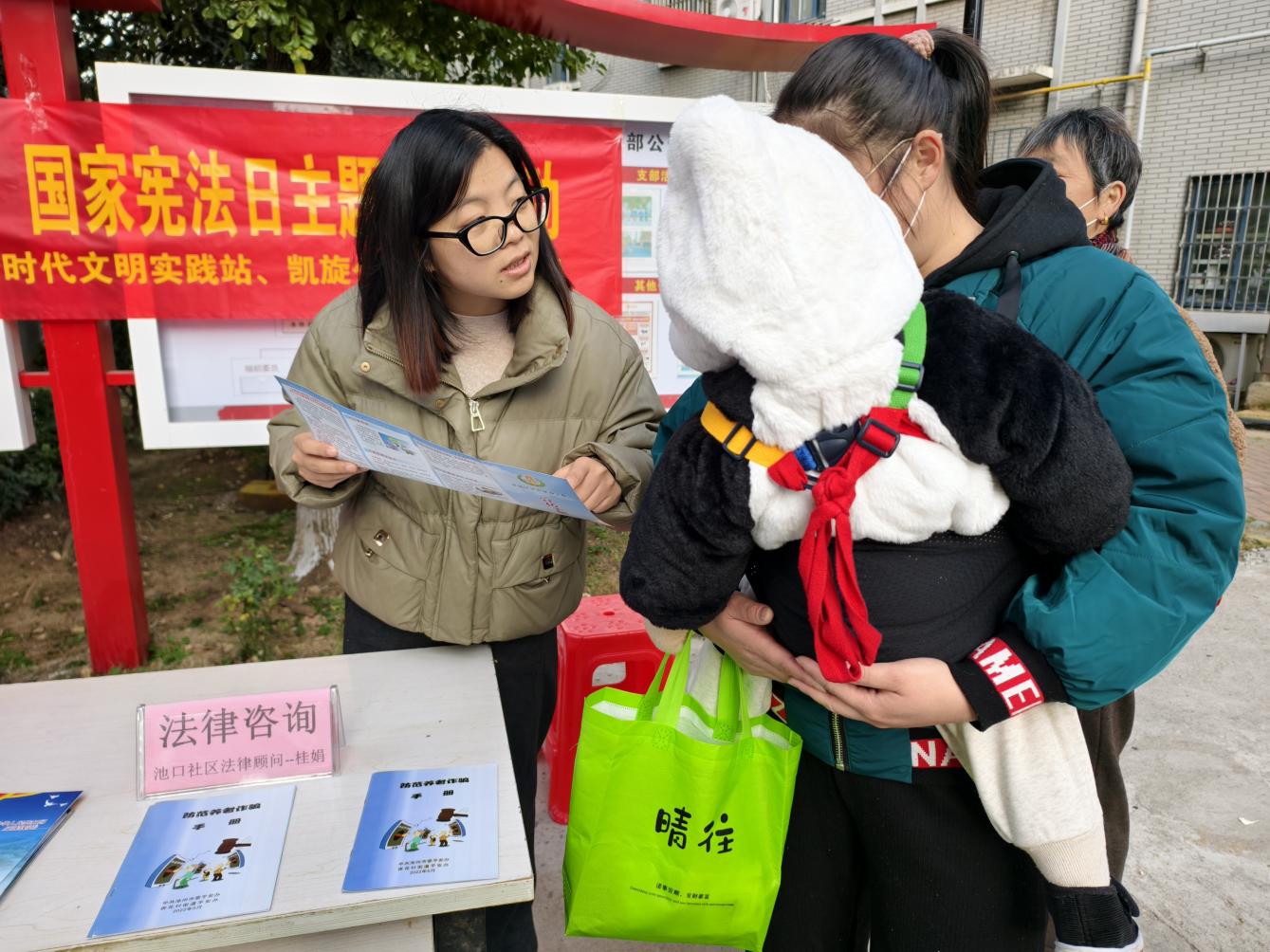 202512月4日是第十二个国家宪法日,为推动宪法精神走进基层,浸润民心,12月4日上午,池口社区邀请社区法律顾问天贵律师事务所桂娟律师在辖区小区开展“法治进万家,宪法伴我行国家宪法日主题宣传活动。