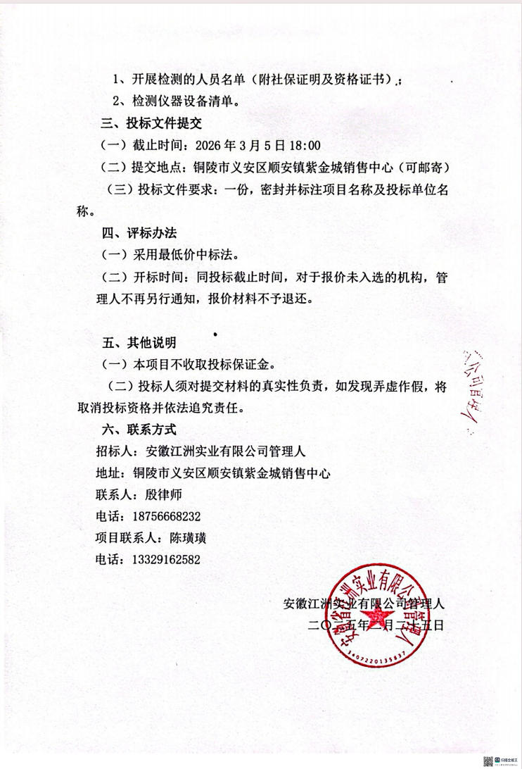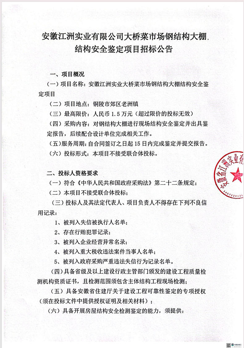 安徽江洲实业有限公司大桥菜市场钢结构大棚结构安全鉴定项目招标公告